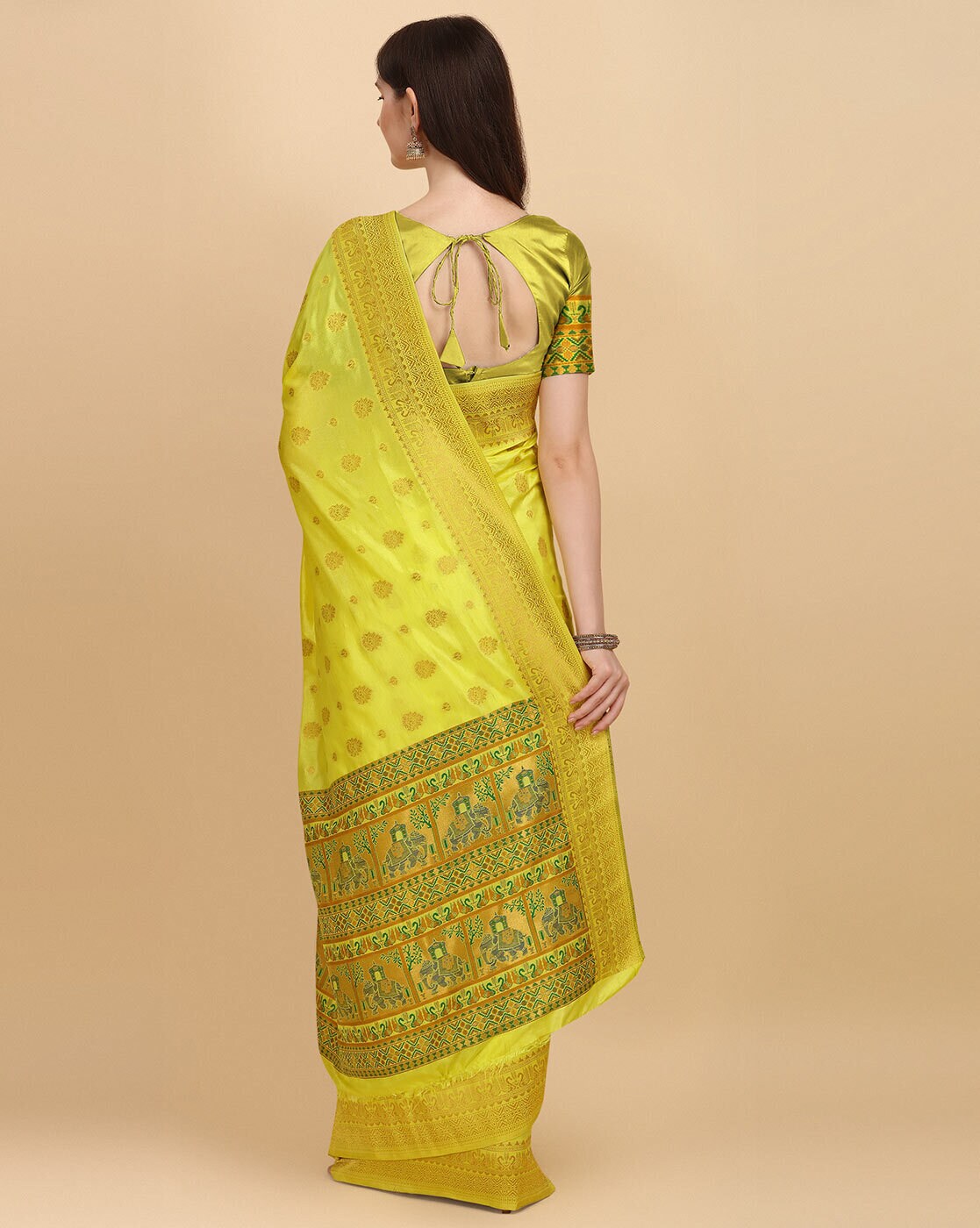 • The last image gives a detailed look of the blouse piece that comes with this saree (The model is wearing a blouse from our in-house wardrobe)