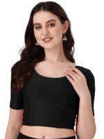 Round Neck Dobby Cotton Lycra Stretchable Elbow Sleeve Readymade Saree Blouse for Women