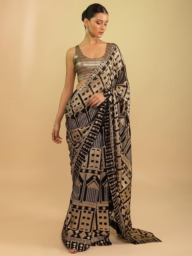 Women’s Black Sequins Work Heavy Georgette Saree with Blouse (1024-Black-Sequins-Designer-Saree-Latest, Black)